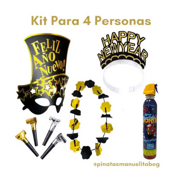 Set de accesorios para 4 personas para celebrar esta año nuevo, este kit incluye: ·2 Antifaces feliz año nuevo ·2 Diademas happy new year ·4 Collares negro con dorado ·4 Pitos ·1 Espuma