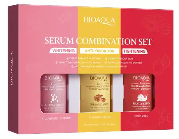 KIT DE SUEROS ACLARANTES BIOAQUA Contiene: - Suero nicotinamida 30ml: Aclarante, antioxidante y antiinflamatorio. - Suero curcuma 30ml: Anticane, aclarante y antioxidante. - Suero baba de caracol 30ml: Regenera, estimula colageno y dfumina cicatrices. Un combo poderoso de 3 sueros faciales de 30ml cada uno, diseñados para transformar tu piel: aclaran, regeneran y combaten los signos del envejecimiento. Beneficios: - Aclara y unifica el tono de la piel. - Controlar la oleosidad y ayuda a pieles con acne. - Regenera y estimula la producciòn de colageno. - Reduce manchas y cicatrices y lineas de expresion. - Poder antioxidante que protege contra el envejecimiento prematuro.