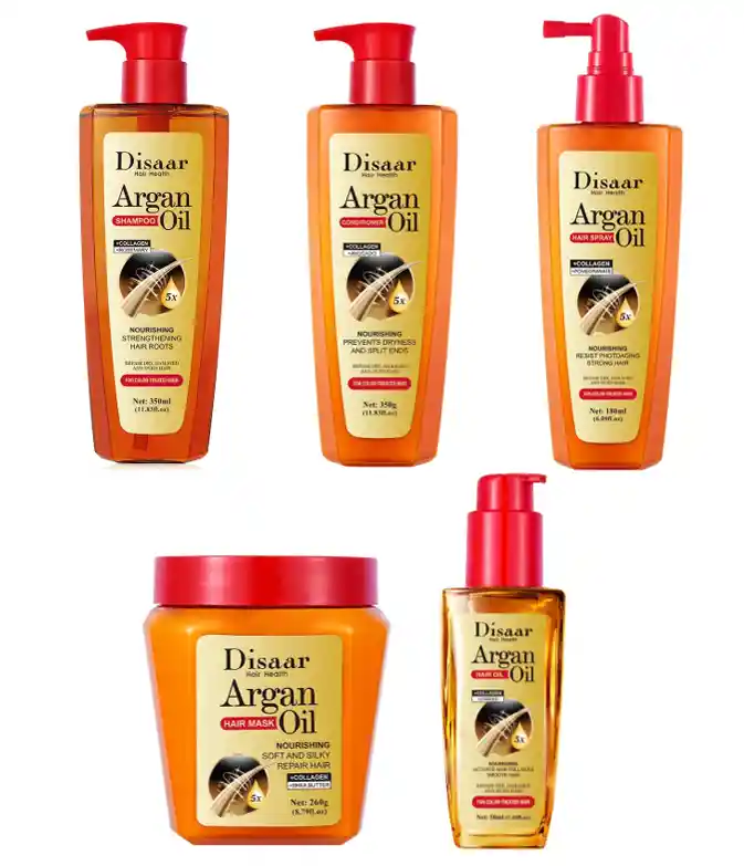 KIT CAPILAR REPARADO CON ARGAN OIL DISAAR PARA CABELLOS MALTRATADOS Y SIN VIDA Contiene: - Shampoo Nutritivo 350ml - Acondicionador Nutritivo 350g - Mascarilla Capilar Intensiva 260g - Termoprotector liquido 180ml - Aceite Argan 50ml Kit reparados con argan. Renueva tu cabello en 5 pasos. Dale nueva vida a tu cabello con nuestro kit de cuidado capilar con Argan, una rutina completa de 5 productos diseñados para reparar, nutrir y fortalecer el cabello dañado y sin vida. El aceite de argan, conocido como "el oro liquido del cabello", es el protagonista de esta podrosa formula rica en acidos grasos, vitamiba E y antioxidante, ayuda a restaurar la hidratante, suavidad y brillo natural de tu cabello. - Shampoo Nutritivo: Limpia suavemente sin resecar, elimina impurezas y acumulacion de productos. - Acondicionador Reestructurante: Desenreda y sella la hidratacion para un cabello mas suave y manejable. - Mascarilla Capilar Intensiva: Tratamiento profundo que repara el daño y fortalece la fibra capilar. - Termoprotector liquido: Protege contra el calor de secadoras y planchas, evitando la quiebra y el frizz. - Aceite de puntas: Sella y nutre las puntas abiertas, dejando un acabado sedoso y brillante. Ideal para todo tipo de cabello, especialmente para cabello secos, dañados o sin vida