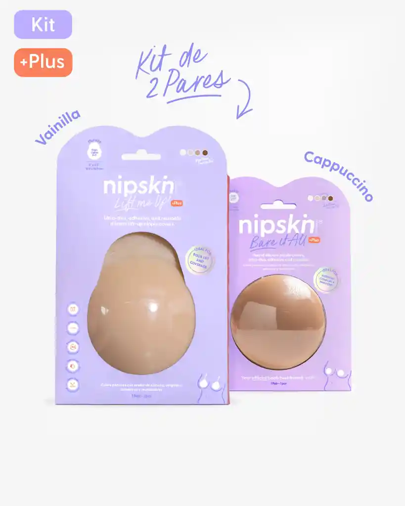 Kit x2 Copas Adhesivas de Silicona - Nipskin® Lift Me Up, Copas adhesivas para levantar el busto Cubre pezones para realce de silicona, ultra-delgados, adhesivos y reutilizables, hechos 100% de silicona de grado médico. NO contienen látex. Tienen un acabado matte, lo cual permite que el producto no refleje luz debajo de la ropa. TALLA PLUS: Vienen en un tamaño de 12.5x16.5 cm para brindarte mayor cobertura y agarre a la hora de realzar. Ideales para copas C-D. Disponible en 4 colores para que elijas el que mejor se adapte al tono de tu piel en la zona del los senos. Color: Vainilla- Pieles claras subtono cálido, más amarillas. Bare it All Nipple Covers - Cubre Pezones Circulares de Silicona Reutilizables Cubre pezones Medium circulares reutilizables, adhesivo e hipoalergénicos, hechos 100% de silicona de grado médico. NO contienen látex. Tienen un acabado matte, lo cual permite que el producto no refleje luz debajo de la ropa. Vienen en un tamaño de 10 cm para brindarte mayor cobertura e invisibilidad. Ideales para copas C-D. Disponible en 4 colores para que elijas el que mejor se adapte al tono de tu piel en la zona del los senos. Color: Cappuccino - Pieles morenas claras o bronceadas, subtono cálido.