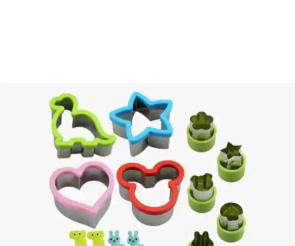 Juego de cortadores de sándwiches de acero inoxidable: recibirás cortadores de verduras para niños, incluye 4 cortadores de sándwich de pan, más 4 formas de cortador de frutas, 10 bonitos palillos de alimentos para animales, suficientes formas y cantidades para satisfacer el uso diario de tu hijo.