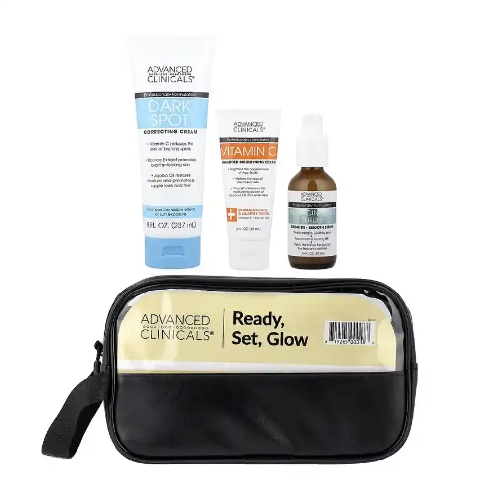 Descripción: Producto probado por dermatólogos. Producto no probado en animales. Ingredientes clínicamente probados. Contiene lo siguiente: Crema correctora de manchas oscuras, 237 ml (8 oz. líq.) Crema iluminadora avanzada con vitamina C, 59 ml (2 oz. líq.) Sérum con 5 % de niacinamida, 52 ml (1,75 oz. líq.) Bolsa de viaje Crema correctora de manchas oscuras: - Producto formulado por profesionales. - La vitamina C reduce la apariencia de las manches y la pigmentación irregular. - El extracto de regaliz promueve una piel de aspecto más lumimoso. - El aceite de jojoba restaura la humectación y promueve una apariencia y una sensación de tersura. - Minimiza los efectos visibles de la exposición al sol. - Sin alcoholes añadidos que resecan la piel. - Nos importa: producto no probado en animales. - Sin tintes añadidos. Crema iluminadora avanzada con vitamina C: - Producto formulado por profesionales. - Ilumina la apariencia de las manchas de la edad. - Refina el aspecto de la piel con tono desigual. - Su piel se merece el poder humectante del aceite de coco y el aloe vera. - Producto probado contra alergias por dermatólogos. - Vitamina E. - Ácido ferúlico. - No causa irritación. - Producto clínicamente probado. - Efecto humectante. Sérum de niacinamida al 5 %: - Producto formulado por profesionales. - Sérum iluminador y suavizante. - Desbloquee un brillo intenso y juvenil. - Deshágase del aspecto irregular de la piel. - Disminuye visiblemente el aspecto de las líneas finas y las arrugas. - Sin alcoholes añadidos que resecan la piel. Producto no probado en animales. - Fórmula de absorción rápida. - Fórmula liviana e hidratante. Beneficios: - Disminuye visiblemente la apariencia de las manchas oscuras y los tonos irregulares. - Deja la piel hidratada y tersa. Atributos: La niacinamida antioxidante, una forma antienvejecimiento de la vitamina B, reduce la apariencia de la decoloración irregular. Producto enriquecido con ácido hialurónico hidratante y péptidos reafirmantes. Tecnología La niacinamida al 5 % se combina con el ácido ferúlico antioxidante para combatir los signos visibles del envejecimiento. La niacinamida promueve una tez más luminosa, mientras el ácido hialurónico atrae la humedad hacia la piel seca para lograr un efecto voluminizador visible. Descubra una piel brillante y resplandeciente con el poder antioxidante de la niacinamida. Esta forma con efecto antiedad de la vitamina B reduce visiblemente la apariencia de las decoloraciones irregulares. Fórmula ultrahidratante y calmante.