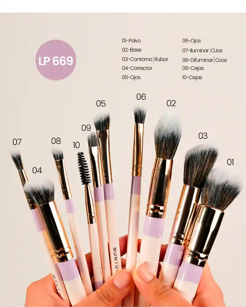 Brochas de maquillaje para rostro y ojos El kit de brochas Fluffy es el combo que necesitas para lograr un maquillaje impecable. Incluye 10 brochas de maquillaje, diseñadas para trabajar rostro y ojos con precisión, difuminado y cobertura total. Cada una está creada con pelo sintético ultra suave, ideal para aplicar todos tus productos de forma pareja. Este set combina funcionalidad y diseño: los mangos ergonómicos vienen en 5 tonos en tendencia que se ven increíbles en tu tocador y se sienten cómodos en la mano. ¿Qué contiene el kit de brochas Fluffy? 1 Brocha redonda para base: Ideal para lograr mejor cobertura sin líneas marcadas. 1 Brocha para corrector: Cubre toda la zona de la ojera con precisión. 1 Brocha angular para contorno: Esculpe el rostro y marca el pómulo. 1 Brocha para polvo: Perfecta para sellar el maquillaje o aplicar rubor. 1 Brocha para cejas con spooling: Define y peina tus cejas. 1 Brocha plana para aplicar sombras. 2 Brochas angulares para difuminar ojos: Esenciales para lograr transiciones suaves. 1 Brocha suelta para difuminar: Ideal para ahumar o suavizar cortes. 1 Brocha plana de precisión: Útil para detalles en el párpado inferior o línea de pestañas.
