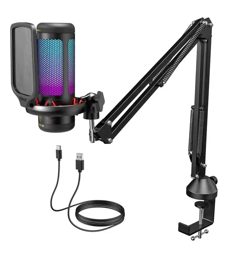 Reproducción de sonido En tiempo Real El kit de micrófono para juegos ha sido diseñado con un chipset de sonido premium de 16 mm y una alta frecuencia de muestreo de 192 kHz/24 bits que garantiza una captación de sonido clara y nítida. El patrón polar cardioide y la función de reducción de ruido pueden capturar un sonido claro, suave y vívido y suprimir el ruido de fondo no deseado. Los micrófonos de computadora con filtros antipop y soportes antivibración pueden reducir los chasquidos o la distorsión cuando respira por la boca. Geniales efectos de iluminación RGB dinámicos RGB degradado automático hace que el micrófono de tu PC sea la guinda del pastel. Con efectos de luz suaves y coordinados, el video de tu juego o la transmisión en vivo serán más llamativos a través del micrófono USB con brazo articulado. La luz animada reflejada en el micrófono para juegos enriquece el video de tu juego o la escena de transmisión. El micrófono USB en color para PC te coloca en la parte superior de la lista de videos o transmisiones en YouTube. Control de audio intuitivo El micrófono de condensador para juegos tiene un botón táctil de silencio en la parte superior que es práctico de tocar. Puedes silenciarlo rápidamente durante una transmisión para evitar un sonido de fondo accidental. La luz RGB se apaga cuando el micrófono de la computadora está silenciado y se enciende cuando se cancela el silencio, lo que le permite ver claramente de un vistazo. Perilla de monitoreo y ganancia El conector para auriculares de 3,5 mm proporciona monitoreo de voz del juego sin cortes aleatorios. Escuche claramente a sus compañeros de equipo con los que está hablando, así como a usted mismo, para obtener información instantánea, ya sea que esté demasiado alto o no. Hay una perilla de ganancia de micrófono sensible en la parte inferior del micrófono de la computadora para que pueda ajustar el volumen del micrófono fácilmente y grabar sonido más cómodamente. Kit de brazo de pluma perfecto Con una amplia extensibilidad, el micrófono para juegos con brazo articulado es ideal para jugadores que tienen varios elementos en el escritorio. El brazo articulado hecho de metal es lo suficientemente resistente y la abrazadera C encaja perfectamente en la mayoría de escritorios de hasta 1,7" de grosor. Los brazos y el micrófono son ajustables, puede ajustar fácilmente el micrófono al ángulo o altura adecuados para mostrar su voz perfecta. Configuración Plug and Play No se requiere ningún conductor adicional. Este micrófono para transmisión es plug-and-play para PC, computadora portátil, macbook, PS4/5, tabletas y teléfonos. Sonido de alta calidad que hace que este micrófono para PC sea una opción para vídeos de YouTube, podcasts, Skype, grabaciones, streaming o juegos. Parámetros del producto Frecuencia de muestreo 192kHz/24bit Sensibilidad: -38 dB (a 1 KHz) Respuesta de frecuencia: 30Hz-18KHz Directividad: cardioide Nivel máximo de presión sonora: 110DBA Relación señal-ruido: 80dB Voltaje de funcionamiento: 5V Corriente de trabajo: 100mA Botón táctil: presione brevemente para silenciar Función de monitoreo: admite auriculares de 3,5 mm Interfaz de salida/interfaz de entrada: USB/TYPE-C Lista de productos - 1 Micrófono de condensador - 1 Soporte - 1 Cable de datos Para Pc - 1 Red anti-reventón - 1 Adaptador Tipo C Para Celular.