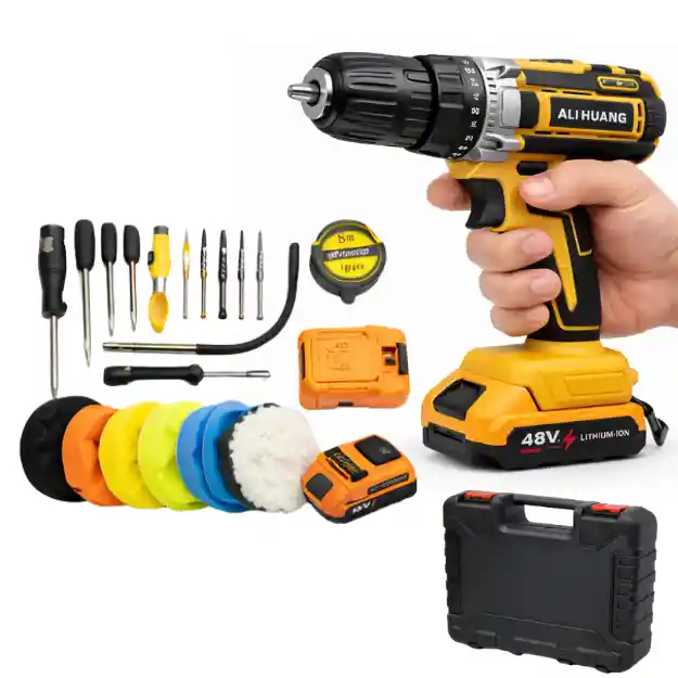 Kit de taladro inalámbrico multifunción con batería de ion de litio, diseñado para realizar trabajos de perforación, atornillado, ensamblaje y pulido de forma práctica y eficiente. Incluye taladro/atornillador recargable de 48V, con sistema de torque ajustable que permite trabajar sobre diferentes materiales con mayor control. Cuenta con giro reversible para atornillar y desatornillar, además de empuñadura ergonómica antideslizante que brinda comodidad durante el uso. El set incorpora una amplia variedad de accesorios como puntas intercambiables, brocas, extensión flexible, herramientas manuales, cinta métrica y discos de pulido en distintos niveles, lo que permite realizar múltiples tareas sin necesidad de herramientas adicionales. Todo el contenido se encuentra organizado en un maletín rígido, facilitando el transporte, el orden y el almacenamiento seguro del equipo. Ideal para uso doméstico, mantenimiento general y trabajos ocasionales. 🔹 Características Taladro inalámbrico multifunción Voltaje de 48V Batería recargable de ion de litio Sistema de torque ajustable multiposición Giro reversible (avance y retroceso) Mandril sin llave Empuñadura ergonómica antideslizante Incluye accesorios para perforar, atornillar y pulir Discos de pulido intercambiables Maletín rígido organizador ⭐ Beneficios Permite realizar múltiples tareas con una sola herramienta Mayor control y precisión gracias al ajuste de torque Facilita el trabajo en diferentes materiales Ahorra tiempo al incluir todos los accesorios necesarios Mejora la comodidad durante el uso prolongado Mantiene el equipo ordenado y fácil de transportar Ideal para el hogar, reparaciones y mantenimiento general