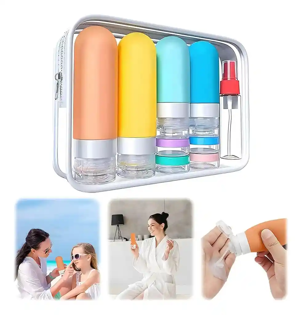 Accesorios de viaje prácticos Este práctico set de viaje viene en una caja con cremallera e incluye: 4 botellas de viaje 4 frascos de viaje 1 botella con spray 2 cucharas 1 embudo 1 cepillo de limpieza 1 etiqueta 1 neceser transparente para maquillaje Los diversos recipientes te permiten llevar diferentes productos de belleza y cosméticos según tus necesidades.