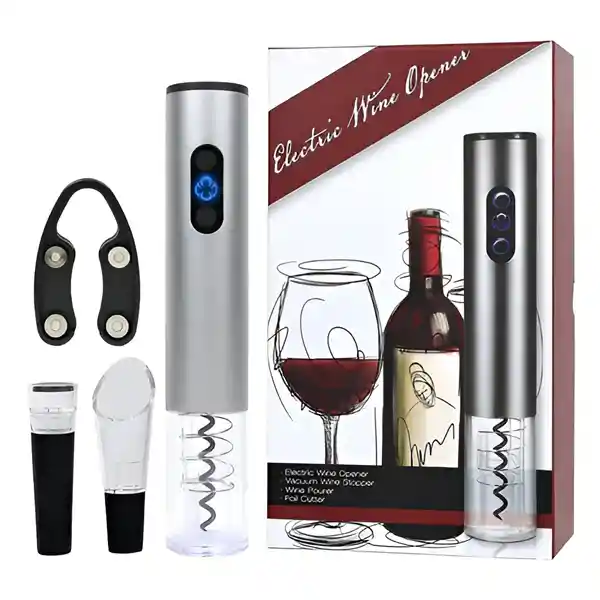 Kit 4 en 1 con Descorchador Eléctrico + Boquilla Vertedora + Tapón de Vacío + Cortador Redondo Elegante cuerpo Metálico y Batería recargable con cable USB tipo C incluido. El complemento ideal para los amantes del vino, abre de manera elegante y rápida las botellas de vino. CARACTERÍSTICAS: • Abre tu vino sin esfuerzo • Cuenta con cable USB de carga • Diseño ergonómico y con doble botón pulsador (arriba y abajo) • Fácil de transportar, almacenar y usar • Batería de litio Recargable • El descorchador funciona con corchos con diámetro de 20 a 24 mm y largo de 44 mm • El descorchador funciona con botellas de vino con un diámetro exterior de cuello de botella de no más de 35 mm y un diámetro interior de cuello de botella de 17,5 mm a 23 mm • La boquilla vertedora funciona con botellas de vino con un diámetro interior de cuello de botella de 18 mm a 19 mm • El tapón de vacío funciona con botellas de vino con un diámetro interior de cuello de botella de 17,5 mm a 20 mm