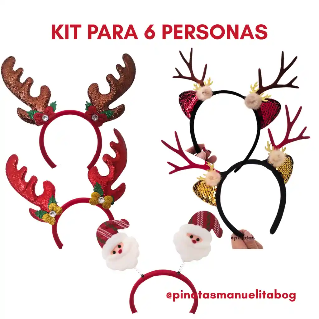 Set de accesorios para 6 personas para celebrar esta navidad, este kit incluye: ·2 Diademas papá noel ·2 Diademas reno ·2 Diademas reno lentejuelas Ideal para que toda la familia o amigos tengan los accesorios para celebrar esta navidad