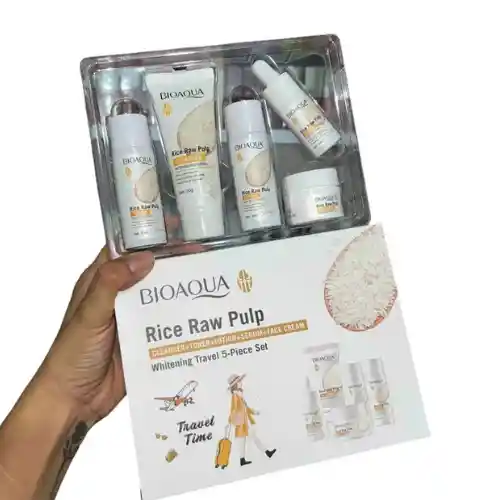 El KIT VIAJERO DE ARROZ Bioaqua (también conocido como Bioaqua Rice Raw Pulp Travel Set) es un set de cuidado facial en formato mini que incluye los productos esenciales de esta línea para limpiar, hidratar y aclarar la piel mientras se viaja. Componentes del Kit Viajero: El kit de viaje de la línea Bioaqua Rice Raw Pulp generalmente viene en una presentación de cinco piezas con tamaños pequeños, ideales para llevar en el equipaje de mano. -Limpiador (Rice Cleanser): Un limpiador suave que ayuda a purificar sin resecar la piel (30g). -Tónico (Rice Toner): Diseñado para refrescar, equilibrar la humedad de la piel y prepararla para los siguientes pasos (30ml). -Loción (Rice Lotion): Una hidratante ligera que proporciona nutrición (30ml). -Sérum (Rice Serum): Un suero concentrado que nutre la piel, minimiza los poros y proporciona una hidratación duradera (10ml). -Crema (Rice Cream): Una crema que ayuda a sellar la hidratación y los beneficios, dejando la piel suave y luminosa (15g). Beneficios Principales: Los productos de la línea de arroz de Bioaqua están formulados con extracto de pulpa de arroz crudo, conocido por sus propiedades hidratantes, antioxidantes y abrillantadoras. -Hidratación profunda: Contiene ingredientes como el ácido hialurónico, que retiene la humedad para una piel tersa y húmeda. -Aclarante y unificador del tono: El extracto de arroz y la niacinamida ayudan a reducir las manchas oscuras y a promover un tono de piel más uniforme y radiante. -Antioxidante: Rico en vitamina E y vitaminas del complejo B, ofrece un efecto antioxidante que ayuda a proteger la piel del daño ambiental. -Apto para todo tipo de piel: Aunque es ideal para pieles mixtas a grasas, su fórmula hipoalergénica (libre de alcohol y parabenos, según algunas fuentes) y nutritiva lo hace adecuado para todos los tipos de piel.