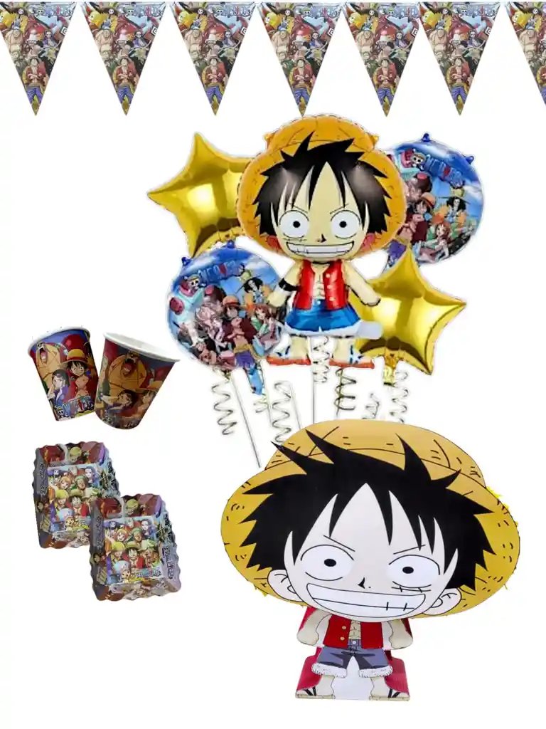 Kit de decoracion one piece 1 banderin largo de 3 metros aproximados 12 vasos 12platos 1 piñata 5 globos metalizados grandes los globos se envian sin inflar si deseas algo adicional indicanos y con gusto te colaboramos