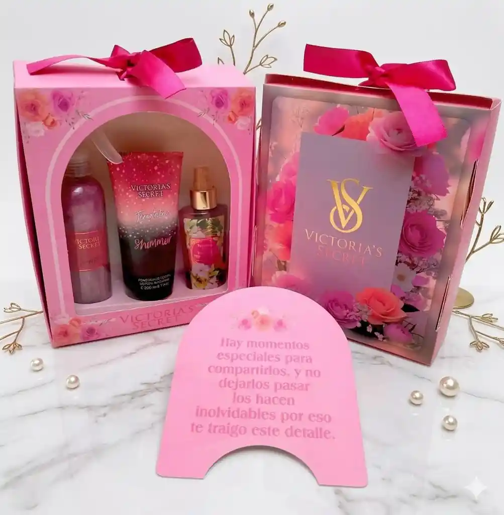 Set de regalo Victoria’s Secret con splash perfumado y crema hidratante, presentados en un empaque rosa con flores y lazo. Un detalle sofisticado que combina aroma, brillo y cuidado para la piel.