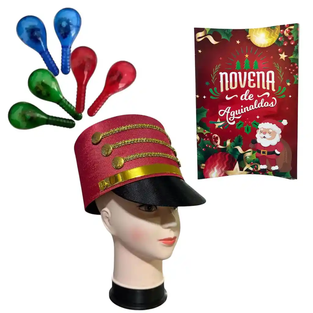 Kit para tu hermosa y diferente navidad donde llevas una novena un par de maracas con luz y un sombrero de cascanueces que es el complemento de este kit Vienen tres colores diferentes de maraca tenemos azul varde y rojo y te llega colo aleatorio