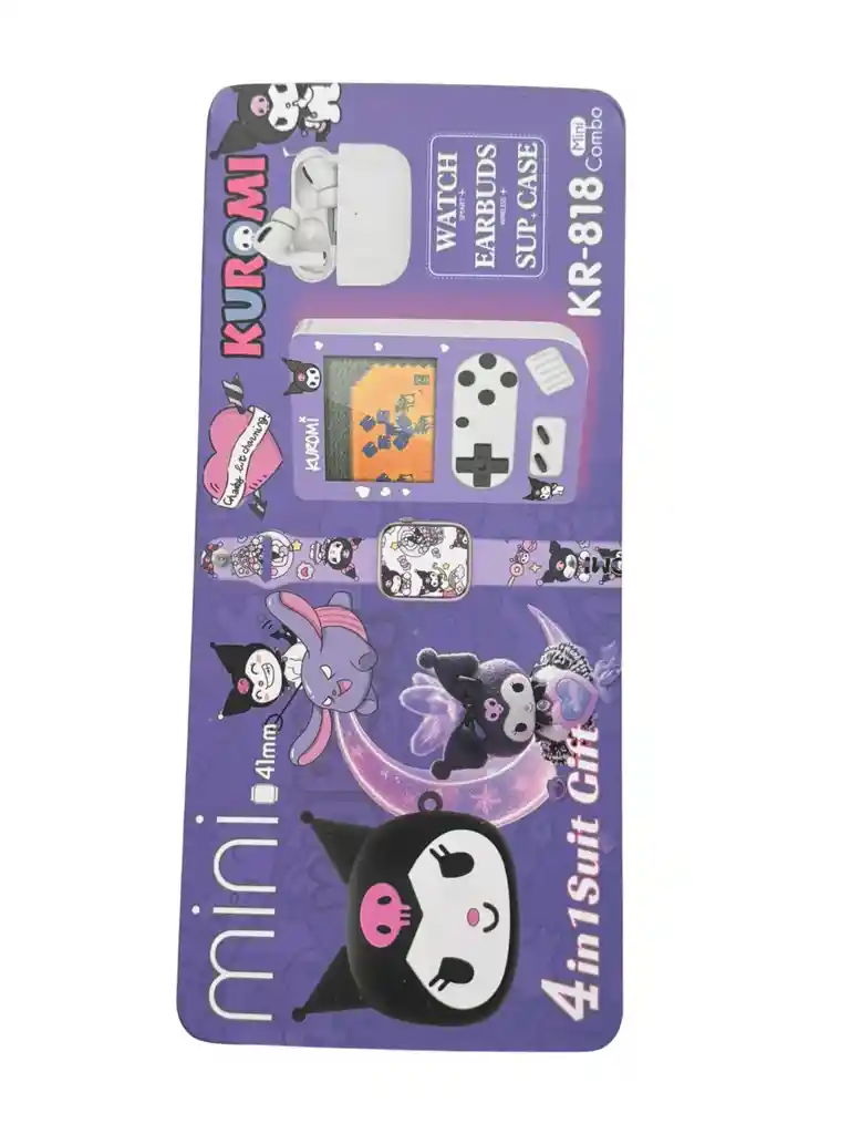 Kit 4 en 1 KUROMI (KR-818) - ¡Edición Limitada! Todo lo que Amas de Kuromi: Un combo imprescindible para fans de Sanrio. 4 Accesorios Temáticos: Incluye [WATCH*] (banda/correa para reloj), [EARBUDS SUP. CASE] (estuche para audífonos), [MINI] (consola de juego de mano o accesorio similar) y más. Estilo Único: Diseño en colores morados y negros con ilustraciones de Kuromi. ¡El regalo perfecto! Lleva el estilo kawaii y rebelde de Kuromi contigo.