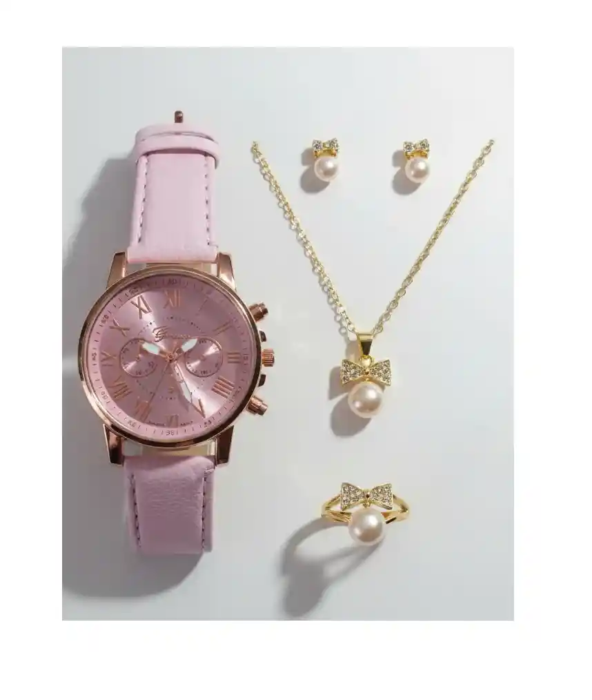 Kit Reloj Rosa Para Mujer + Juego De Collar Aretes Pulsera Lindo kit de reloj para dama con accesorios, ideal para un buen detalle El kit contiene: 1 reloj para mujer color rosa diseño elegante con correa en cuero sintético, sistema análogo. 1 juego de collar + pulsera + aretes en color oro rosa con rosa todo en diseño en fantasía fina, tal como se muestra en las fotos. se recomienda no aplicar cremas directamente, ni perfume para su máximo cuidado y durabilidad. Se envía en caja tipo almohada todo el kit