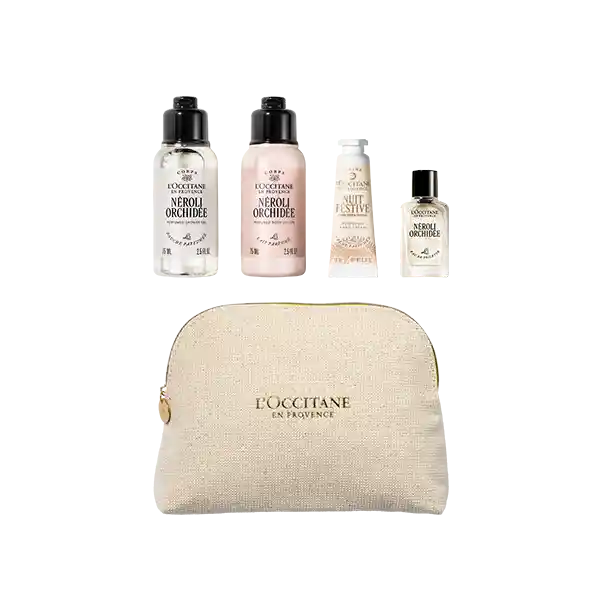 Este Kit contiene: Gel de Ducha Néroli Orchidée (Antes Nerolí & Orquídea) 75ml, Leche Corporal Néroli Orchidée (Antes Nerolí &Orquídea) 75ml, Crema para Manos Nuit Festive Grosella Negra y Vainilla 10ml, Perfume Néroli Orchidée (Antes Nerolí & Orquídea) Eau de Toilette 7,5ml, Bolsito BeigeL’Occitane."