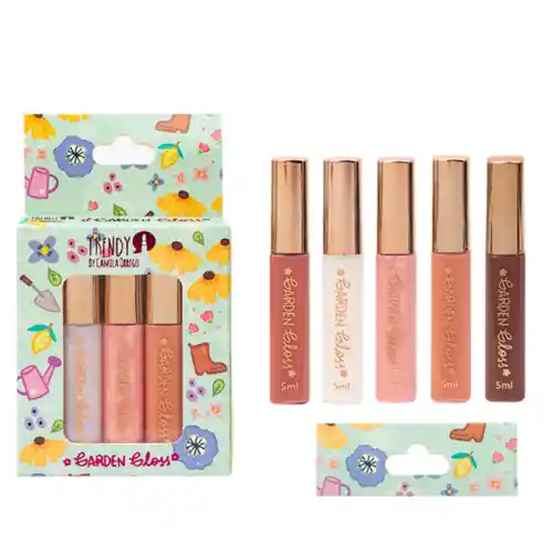 El KIT X5 GARDEN GLOSS Trendy es un set de cinco brillos labiales con tonos variados y un delicioso aroma, conocidos por su textura suave y acabado brillante e hidratante. Son versátiles y pueden usarse solos o sobre labiales mate. Características Principales -Tonos Variados: Cada kit incluye 5 tonos surtidos que van desde rosas, nudes, tierras, neutros hasta rojizos. Vienen en presentaciones satinadas y neutras. -Beneficios: Ayudan a realzar el color de los labios, contribuyen a mantener la hidratación y proporcionan un acabado atractivo y brillante. -Textura y Aroma: Tienen una textura suave y cómoda que se desliza fácilmente. Además, poseen un aroma delicioso, descrito por algunos como frutal. -Uso Versátil: Se pueden aplicar directamente sobre los labios limpios o combinarse con labiales mate para un efecto luminoso adicional. -Portátil: El formato compacto de los brillos y la caja los hace prácticos para llevar en el bolso o neceser
