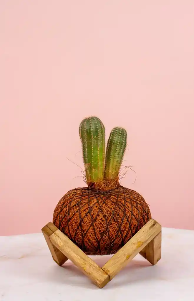 Descubre la unión perfecta entre el arte japonés y la naturaleza desértica con nuestra Kokedama de Cactus "Doble Silueta". Esta pieza escultórica presenta dos esbeltos tallos de cactus elevándose desde una esfera compacta de musgo y fibra de coco, que le confiere una textura rústica y sofisticada. La kokedama se exhibe elegantemente sobre una base de madera natural de líneas minimalistas, incluida para destacar su diseño único. Este arreglo no solo es un elemento decorativo de gran impacto visual y estilo moderno, sino que también es extremadamente fácil de cuidar, requiriendo abundante luz y un riego muy espaciado, lo que lo convierte en un regalo original y duradero para cualquier espacio.