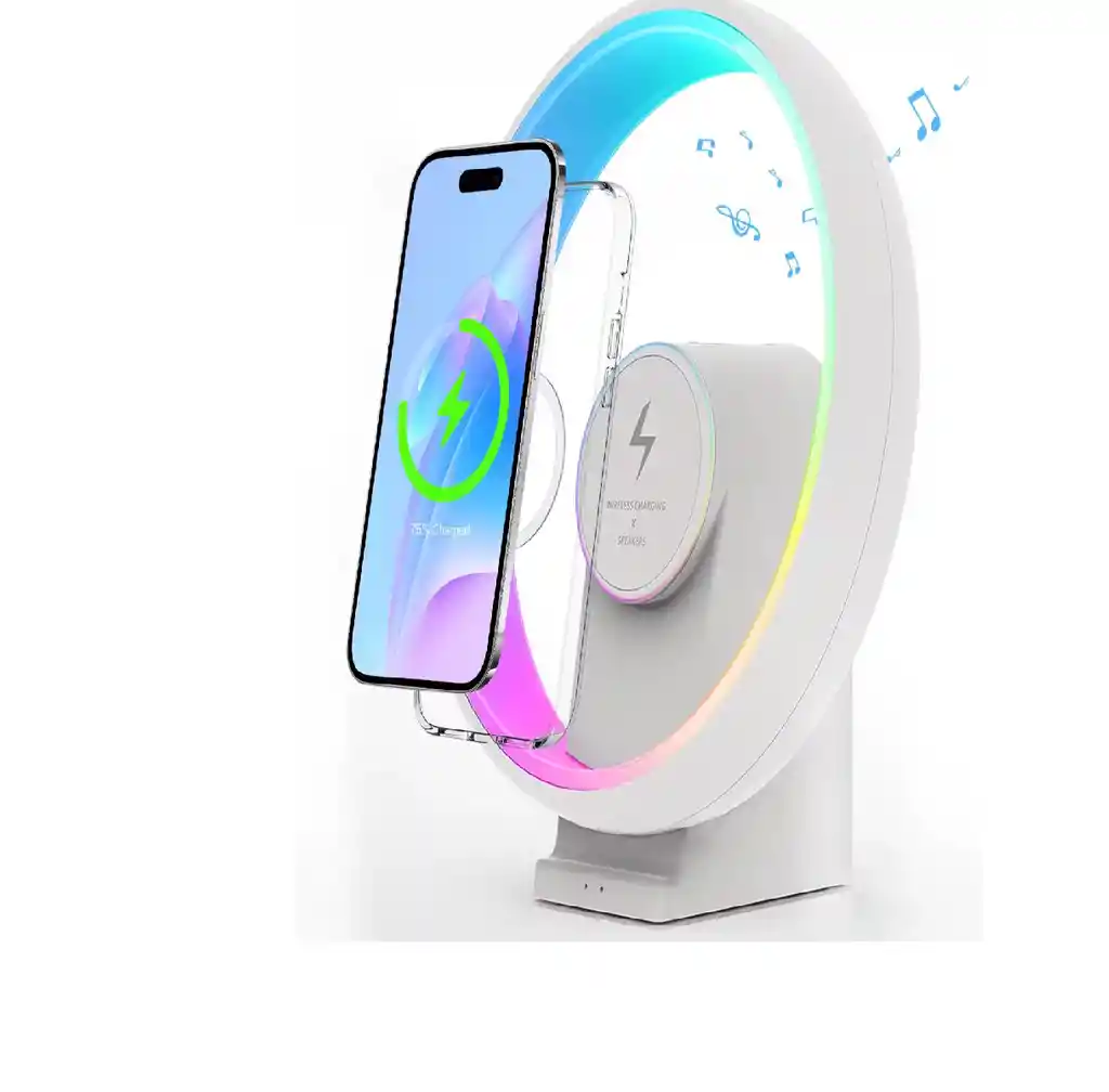 Lámpara led con parlante, reloj despertador y cargador inalámbrico de 15W