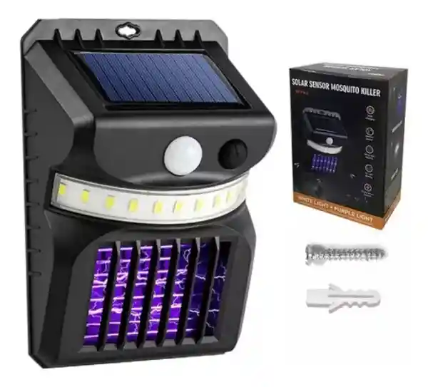 Lampara mata moscos- W792-1 1. Mata insectos mejorados: use luz ultravioleta para atraer insectos voladores como mosquitos y moscas a la red de alto voltaje y destrúyalos de inmediato. Equipado con luces LED activadas por movimiento, proporciona una excelente iluminación que convierte los espacios oscuros en luminosos. 2. Tres modos de trabajo: esta lámpara para matar mosquitos se puede cambiar entre el modo de lámpara de pared, el modo para matar mosquitos y dos modos que funcionan al mismo tiempo presionando el interruptor de encendido. Cargue al sol durante el día, comience a funcionar automáticamente por la noche, los efectos de iluminación son luz blanca, luz amarilla, luz púrpura. 3. Ahorro de energía: el mata mosquitos eléctrico está equipado con paneles solares y baterías recargables. Póngalo a la luz solar intensa y se cargará, lo que puede ayudarlo a ahorrar en las facturas de electricidad. Es amigable y seguro para el medio ambiente humano. 4. FÁCIL INSTALACIÓN: Cada lámpara de pared solar para matar mosquitos viene con todos los accesorios necesarios para una instalación rápida y fácil. Se puede instalar en paredes, puertas, cercas, árboles o en cualquier lugar donde haya un problema con los insectos voladores. 5. Diseño resistente a la intemperie: está hecho de material duradero y de alta calidad, y su diseño resistente a la intemperie IP44 le permite usarlo con viento y lluvia. W792-1