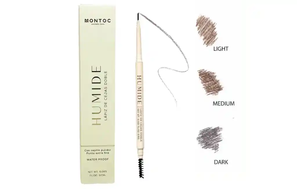 Lápiz de Cejas Doble Humide Montoc Cejas perfectas desde todos los ángulos Logra unas cejas definidas y con mucho estilo. Este lápiz además de su punta delgada en diagonal tiene una formulación suave y cremosa para lograr un trozo perfecto y muy natural. Este lápiz de cejas doble humide Montoc, además de su punta delgada en diagonal tiene una formulación suave y cremosa para lograr un trozo perfecto y muy natural. Transforma tus cejas en verdaderas obras de arte y sorprende con una mirada más intensa y expresiva. Con nuestro lápiz retráctil, lograrás un diseño preciso y natural en segundos.