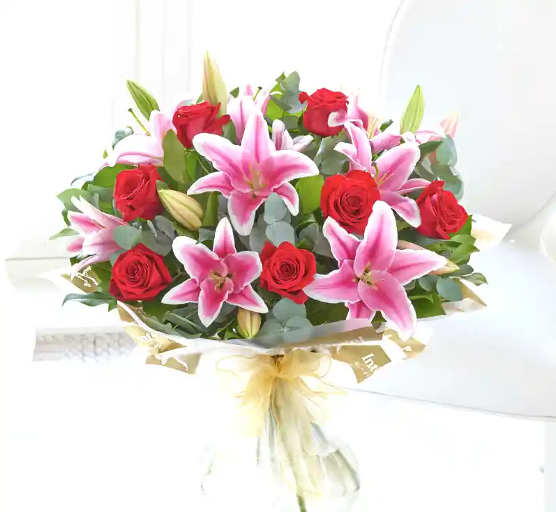 3 varas de Lirio y 7 Rosas, acompañados de flores en verde con cubierta transparente y cinta. *Este producto incluye flores de acompañamiento en verde