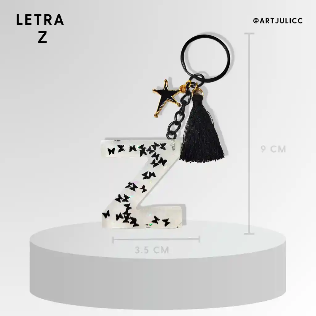 LLAVERO LETRA Z EN RESINA , CON DIJE Y BORLA DECORATIVA COLOR BLANCO CON MARIPOSAS NEGRAS