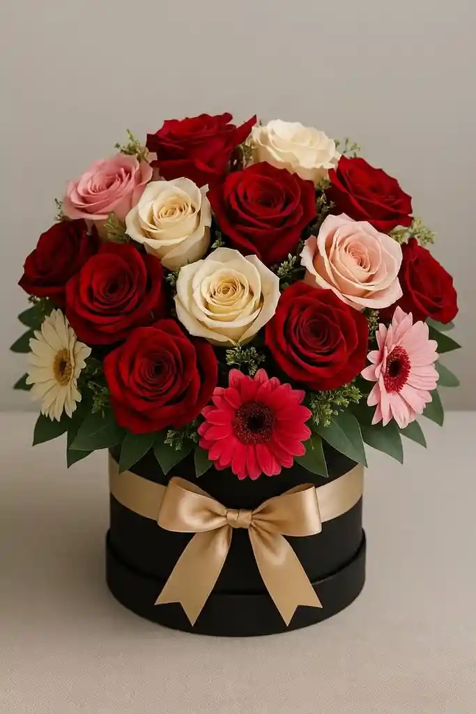 Caja floral de lujo con una combinación de rosas rojas, rosas pastel y crema, acompañadas de gerberas frescas. Presentación premium ideal para expresar amor, gratitud o celebrar momentos inolvidables.