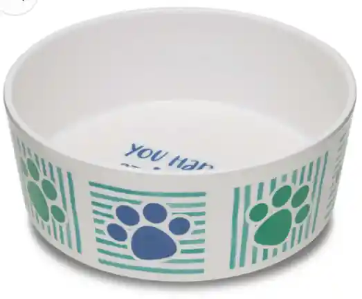 Comedero para perros hecho en plástico, es antideslizante gracias a las patas de goma en la parte inferior y presenta un encantador diseño de estampado de huellas de perro azul y verde con las palabras "You Had Me at Woof" escritas en el fondo interior del plato. Cuidar a tu perro significa encontrar los mejores productos para mantenerlo feliz y saludable, este comedero es una opción elegante y funcional que beneficiará a cualquier perro.