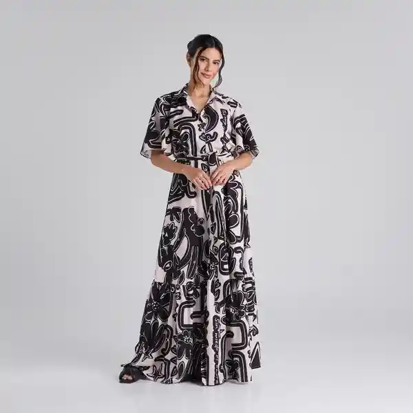 Vestido camisero largo arena- negro con cuello clásico y cierre frontal de botones. Cuenta con un bolero en la parte inferior, manga corta, dos pasadores laterales y cinturón removible. Composición: 88.7% poliéster, 11.2% elastómero. La modelo mide 1.60 m y usa talla S. Cuidados especiales: Leer la etiqueta de cuidados antes de lavar.