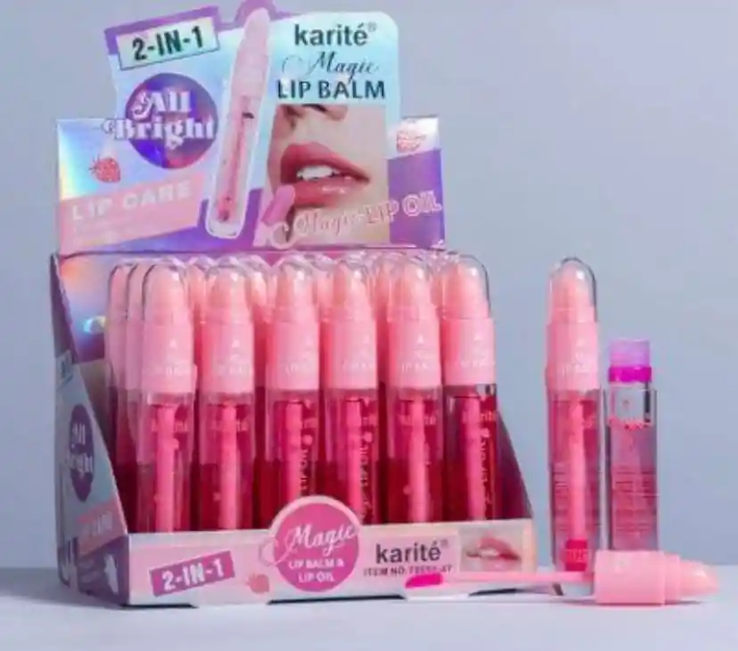 producto de la imagen es un bálsamo labial de la marca Karité, conocido como "Magic Lip Balm" o "Magic Lip Oil". Este producto está diseñado para hidratar y suavizar los labios. A menudo, contiene ingredientes como manteca de karité, vitamina E y aceites nutritivos. Algunas versiones de estos bálsamos labiales son "mágicas" porque cambian de color según el pH de los labios del usuario, proporcionando un tono sutil y natural. Se puede utilizar solo para un brillo natural o como prebase antes de aplicar un labial. Existen versiones que también actúan como voluminizadores de labios.
