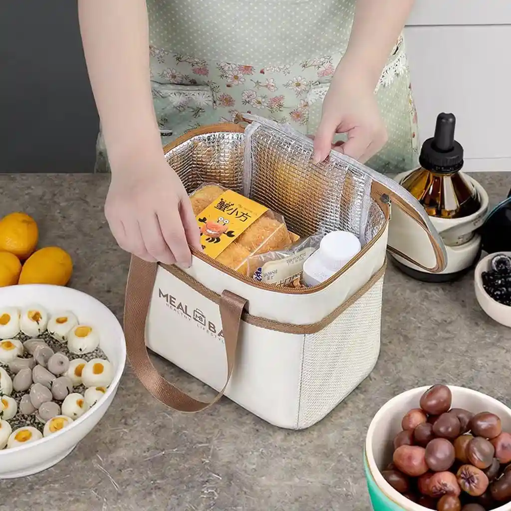 Maleta lonchera térmica portatil medidas: 24cmx23cmx16cm, colores: negro y beige