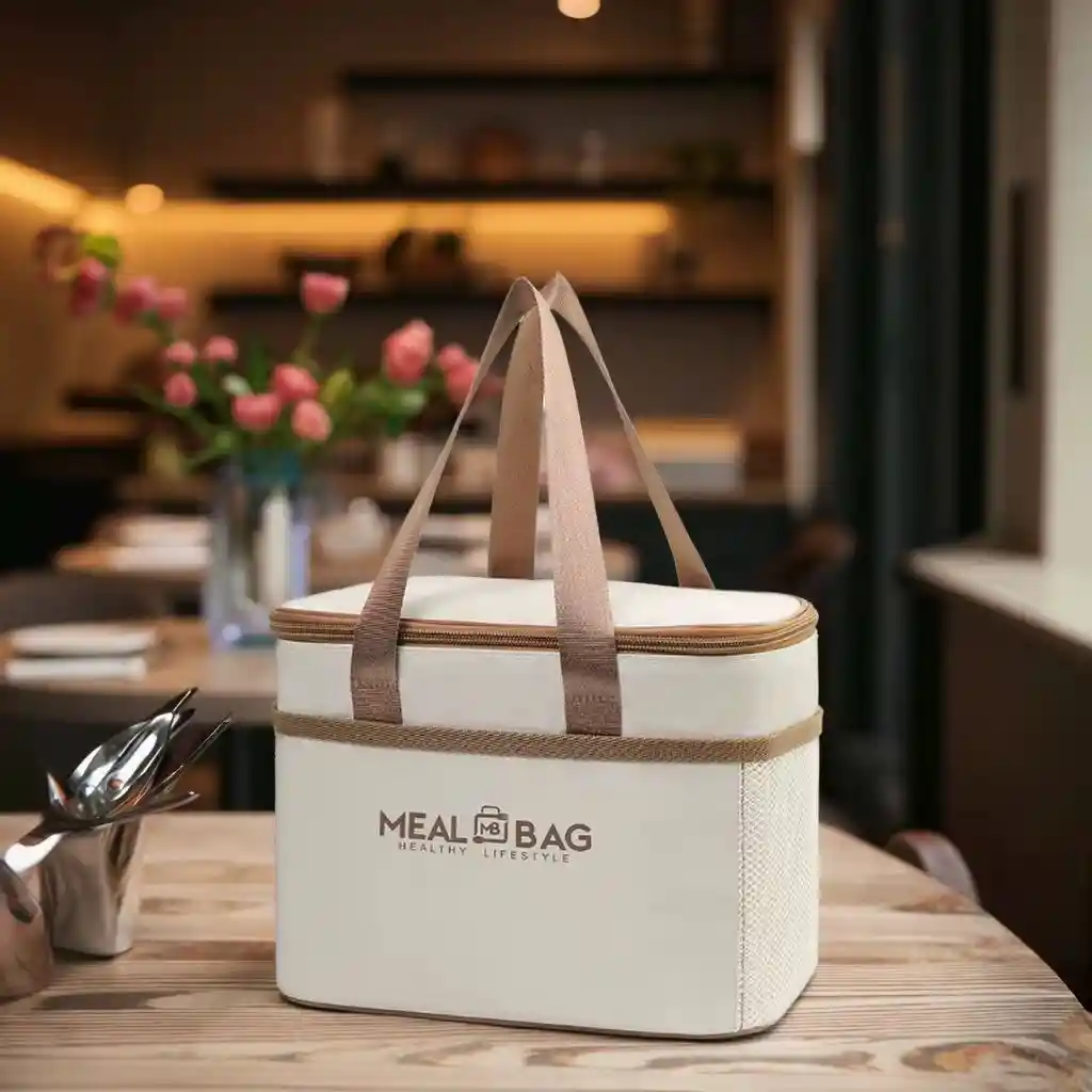 Maleta lonchera térmica portatil medidas: 24cmx19cmx16cm, colores: negro y beige