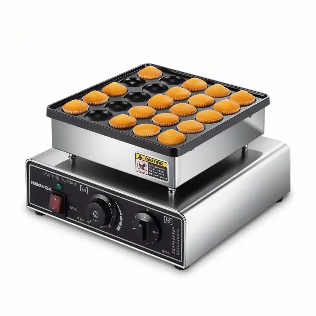 Prepara hotcakes perfectos en grandes cantidades con esta máquina industrial para hotcakes de 25 piezas, ideal para negocios, cafeterías, eventos o para quienes quieren máxima rapidez y producción. Su plancha con 25 cavidades permite cocinar porciones uniformes al mismo tiempo, logrando una cocción pareja y una presentación impecable en cada tanda. Cuenta con control de temperatura para ajustar el punto de dorado según tu receta, facilitando resultados consistentes durante toda la jornada. Su cuerpo en acabado gris tipo acero aporta resistencia, estabilidad y una apariencia profesional, además de ser práctica para limpiar y mantener. Perfecta para optimizar tiempos, atender más pedidos y ofrecer hotcakes esponjosos y bien formados con calidad de nivel comercial.