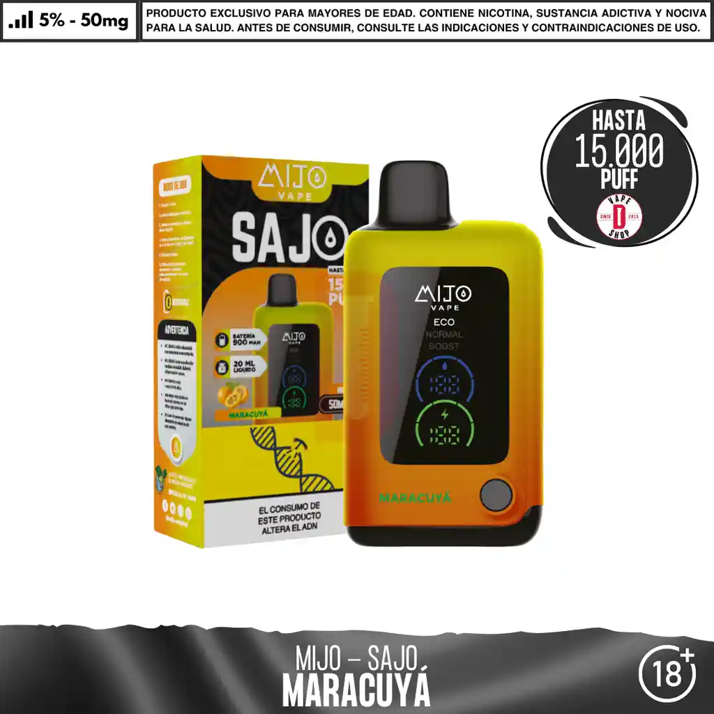 Mijo - Sajo 15000 PUFF. Contenido del paquete:1 dispositivo desechable Concentración de nicotina: 5% de nicotina salina en peso Características del dispositivo: Dispositivo de vapeo desechable Material: Aluminio + PVC + Silicona 3 modos de potencia 20 ml de capacidad 5% de sal nicotina = 50mg / ml 1 dispositivo por paquete Batería: 650 mAh 15000 caladas aproximadamente en modo ECO. Ingredientes: Glicerina Vegetal, Propilenglicol, Aromatizantes Naturales y Artificiales, Ácido Benzoico, Nicotina. Advertencia: Contiene nicotina. Producto para mayores de 18 años. Consulte contraindicaciones antes de consumir.