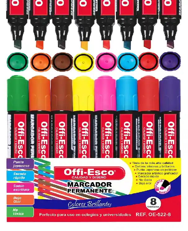 Los Marcadores Offiesco OE-522-8 vienen en un práctico estuche de 8 unidades, ideales para diversas aplicaciones de escritura y dibujo. Con colores vibrantes y duraderos, estos marcadores ofrecen una cobertura suave y uniforme en cada trazo. Punta japonesa de bisel en poliéster y rápido secado. Tinta NO TÓXICA.