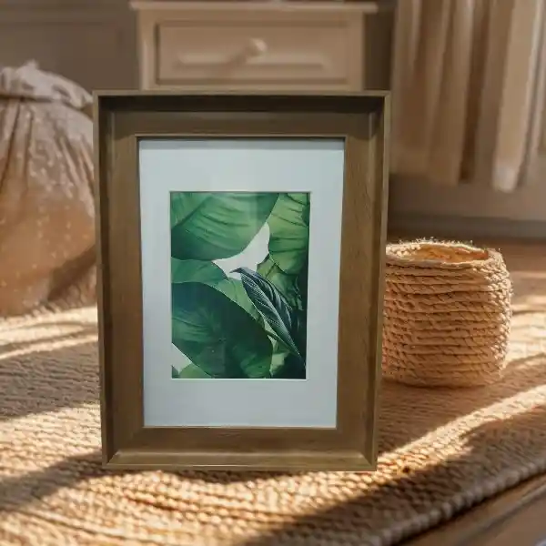 Es un marco de madera con paspartú blanco para resaltar los colores y darle un toque profesional a la imagen que ahí se coloque, además permitiendo que se integre armoniosamente con el espacio donde se coloque ya sea en la pared o sobre una mesa.