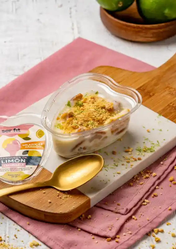 Delicioso postre refrigerado listo para consumir a base de crema de limon sin azucar y galletas tipo maria sin azucar.