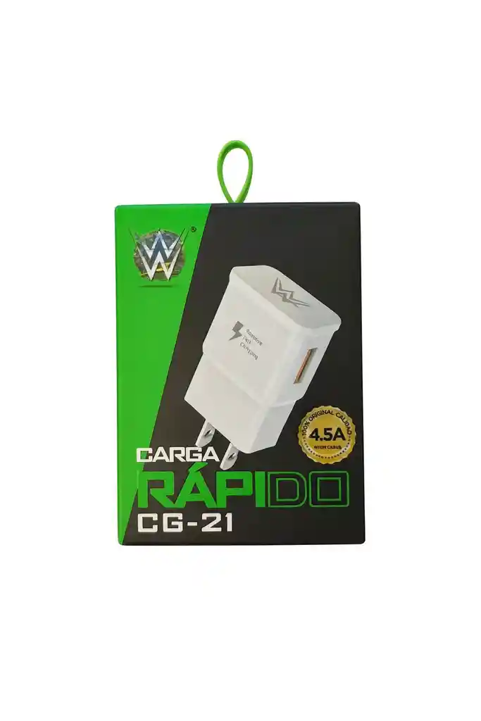 Cargador Rápido CG-21 (4.5A) Cargador de pared con carga rápida 4.5A, ideal para celulares y dispositivos compatibles. Diseño resistente, con puerto USB de alta velocidad para una carga eficiente y segura. Perfecto para uso diario en casa, oficina o viajes.