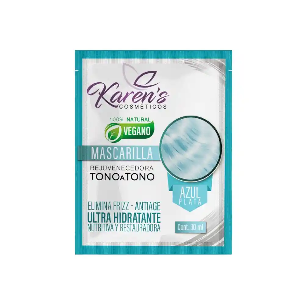 Mascarilla Matizante Rejuvenecedora Tono sobre Tono AZUL PLATA PRODUCTO VEGANO Contiene: 30ml Sachet Bondades: ELIMINA FRIZZ – ANTIAGE ULTRA HIDRATANTE NUTRITIVA Y RESTAURADORA 100% NATURAL – VEGANO La MASCARILLA REJUVENECEDORA TONO A TONO contiene una concentración excepcional de nutrientes en su composición, tales como proteínas, aminoácidos y vitaminas que restauran el cabello, brindándole beneficios como elasticidad, equilibrio y fuerza, que le dan una mejor textura y sedosidad. Todos estos nutrientes le dan vida y salud al cabello, mejoran su peinabilidad, aportan sedosidad, elasticidad y más brillo. Bondades: - Alto Brillo - Reparación Intensa - Sedosidad Extrema - Peinabilidad - Nutrición Profunda - Vitalidad.