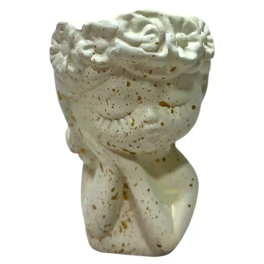 🪴 Matera en cerámica con forma de rostro, moldeada con delicados detalles: ojos cerrados, una corona de flores 🌸 y una mano apoyada al costado de la mejilla, en una expresión serena y contemplativa 😌. La superficie tiene una textura ligeramente rugosa y está decorada con salpicaduras doradas ✨ que simulan motas o destellos sutiles. Perfecta para suculentas, cactus pequeños o como pieza decorativa especial 🏡. 📦 Se envía en el color disponible en tienda al momento de la compra.