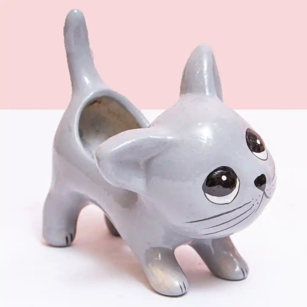 Este tierno gatito en cerámica de acabado gris claro conquista con sus enormes ojos brillantes y su expresión curiosa. Su diseño encantador lo hace perfecto para decorar escritorios, estanterías o rincones especiales con una planta pequeña o suculenta. Ideal para los amantes de los gatos y el diseño kawaii.