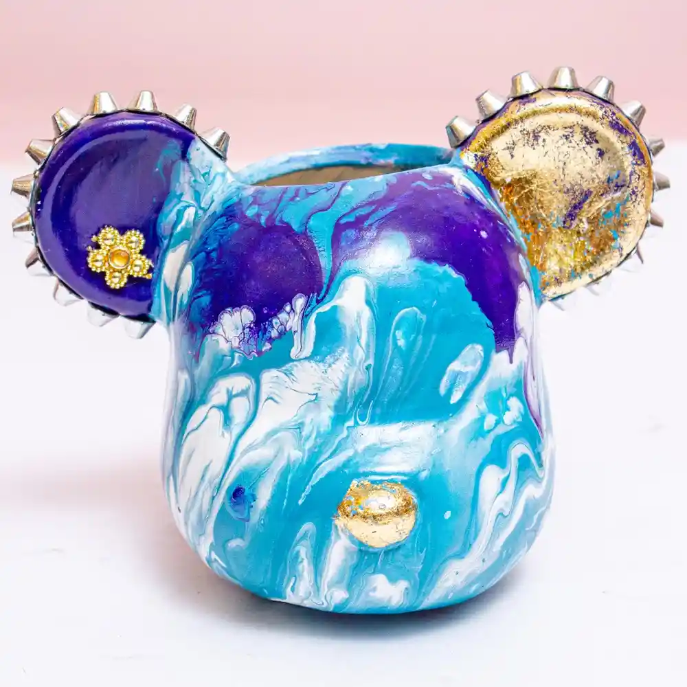 Esta matera de cerámica es una pieza única que destaca por su diseño atrevido y moderno, con forma de oso estilizado. Pintada a mano con una técnica de vertido en tonos azules, violetas y toques de blanco, genera un efecto de fluidez y movimiento muy llamativo. Las orejas, decoradas con picos metálicos plateados y detalles en dorado, aportan un toque punk y sofisticado, mientras que un pequeño adorno en forma de flor realza su encanto. Es ideal para quienes buscan una decoración original, artística y con personalidad propia.