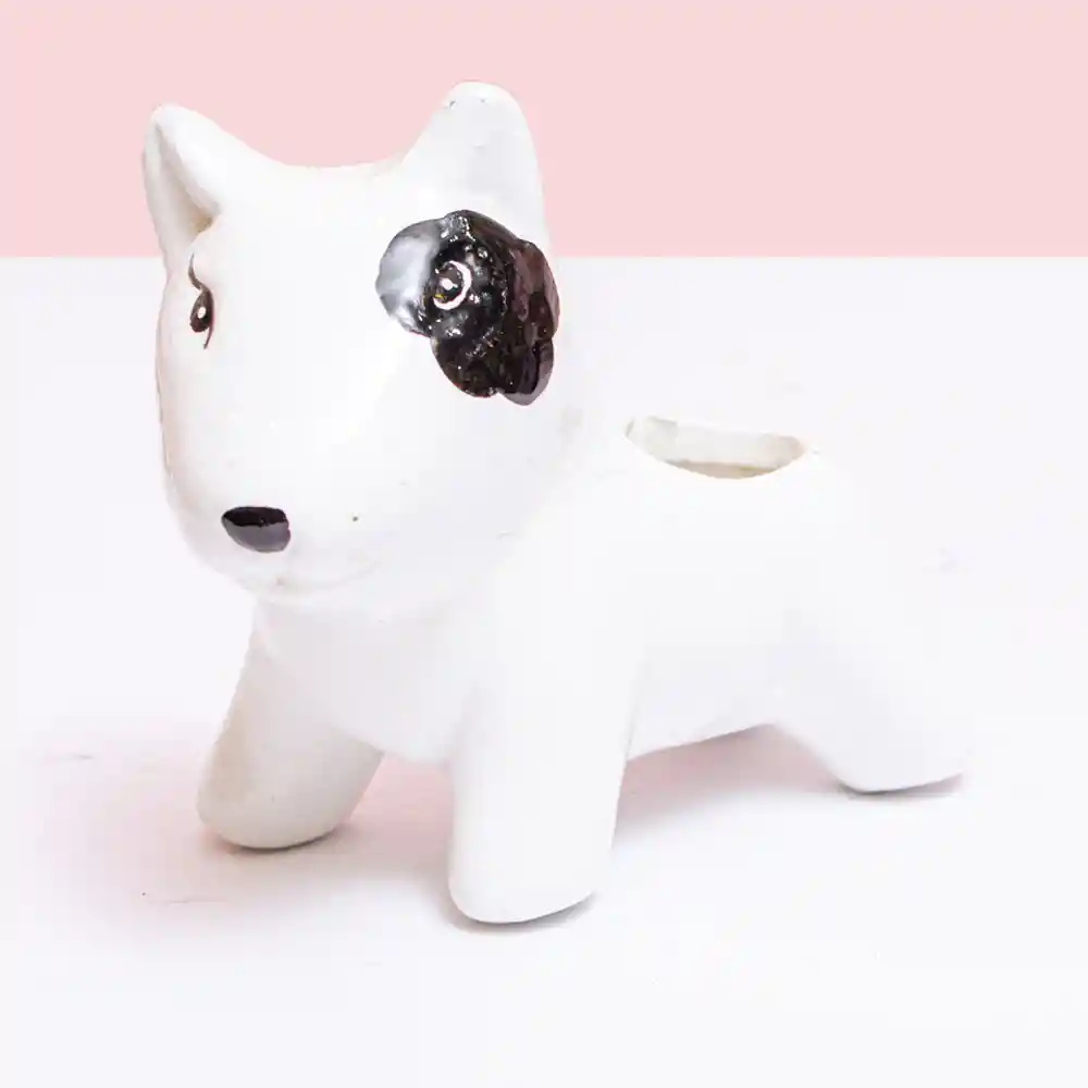Una matera inspirada en la ternura de un cachorro fiel, esta matera tiene forma de perrito blanco con una característica mancha negra en forma de corazón sobre su ojo derecho. Su expresión dulce y simpática la convierte en una pieza ideal para decorar habitaciones infantiles, oficinas creativas o cualquier rincón que necesite un poco de alegría. Ideal para plantas pequeñas o suculentas.