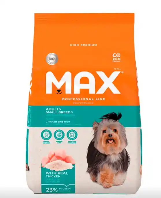 El concentrado para perros adultos de razas pequeñas premium de la línea Professional Line Performance de Max es un concentrado con rico sabor a pollo que aportará una nutrición óptima y balanceada. Su fórmula posee ingredientes naturales, libres de colorantes, sabores y aromas artificiales. Su objetivo principal es reforzar la vitalidad de los perros adultos de razas pequeñas, manteniéndolos activos y llenos de energía para correr jugar y hacer lo que más les gusta. Contiene nutrienes importantes para llevar una sana nutrición como lo son las proteínas para mantener la masa muscular, antioxidantes para mantener fortalecido el sistema inmunológico, vitaminas y minerales. Contiene buenas fuentes de ácidos grasos omegas que favorecerán la salud de la piel y el brillo del pelaje. El concentrado para perros adultos de razas pequeñas premium de la línea Professional Line Performance de Max es un concentrado con rico sabor a pollo que aportará una nutrición óptima y balanceada. Su fórmula posee ingredientes naturales, libres de colorantes, sabores y aromas artificiales. Su objetivo principal es reforzar la vitalidad de los perros adultos de razas pequeñas, manteniéndolos activos y llenos de energía para correr jugar y hacer lo que más les gusta. Contiene nutrienes importantes para llevar una sana nutrición como lo son las proteínas para mantener la masa muscular, antioxidantes para mantener fortalecido el sistema inmunológico, vitaminas y minerales. Contiene buenas fuentes de ácidos grasos omegas que favorecerán la salud de la piel y el brillo del pelaje. Este concentrado para perros adultos de la línea performance de Max fue diseñado pensando en los requerimientos nutricionales de los perros de razas pequeñas, puedes encontrarlo disponible en 2 diferentes tamaños: Bolsa de 8 Kg y 2 Kg. Contiene extracto de yuca para favorecer la calidad de las heces Su fórmula contiene prebióticos para la absorción de nutrientes óptima Libre de aromas y colorantes artificiales