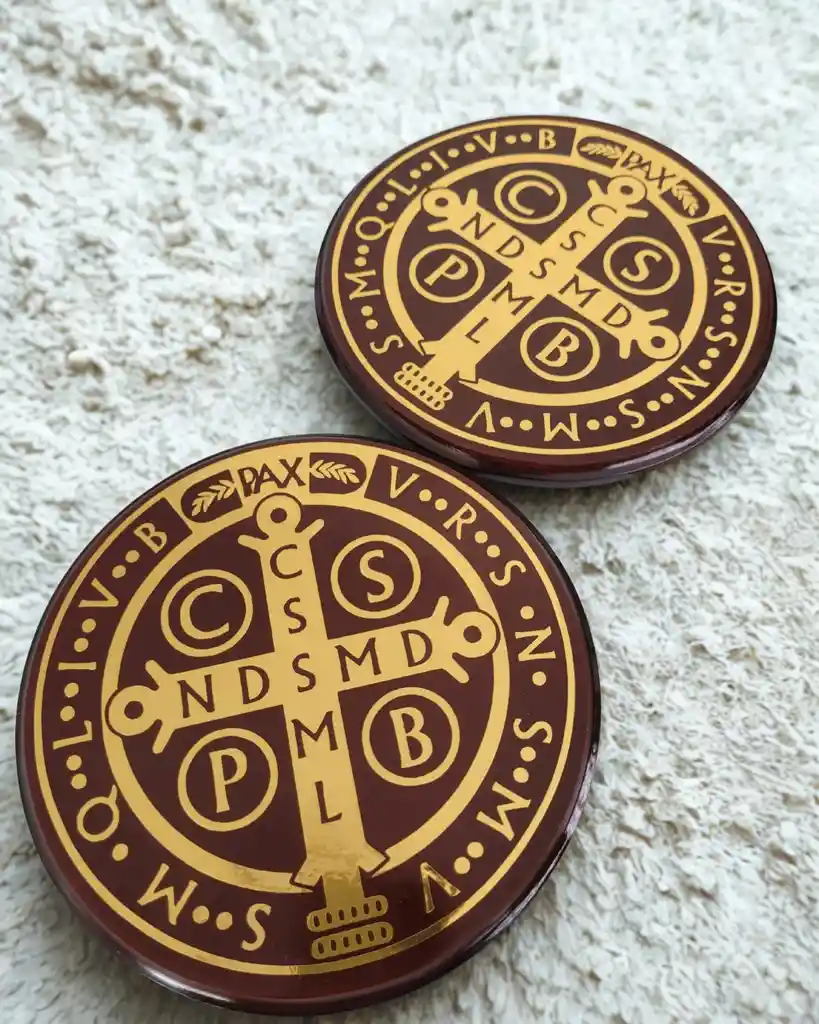 Protección, fe y resguardo espiritual. La Medalla de San Benito es un poderoso símbolo de protección y bendición para el hogar. Colocada en la puerta trasera de la entrada principal, en una repisa o fijada en la pared, actúa como un sello espiritual que protege el espacio de energías negativas, malas intenciones y todo aquello que perturbe la paz del hogar. Esta medalla invita a la presencia de Dios, fortalece la fe y crea un ambiente de armonía, seguridad y tranquilidad para quienes habitan la casa. Es ideal para consagrar el hogar, acompañar la oración diaria o simplemente como recordatorio constante de protección divina. ✨ Un hogar protegido es un hogar en paz. Pieza elaborada en madera MDF, pintura tintilla lacada acabado brillante, y símbolo en vinilo metalizado dorado mate o brillante. Diámetro 20cms. Contiene la oración impresa, y te llegará empacada en caja de cartón.