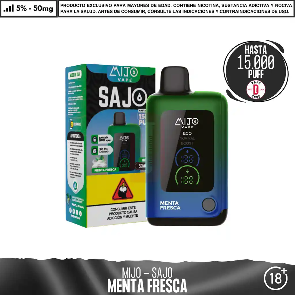 Mijo - Sajo 15000 PUFF. Contenido del paquete:1 dispositivo desechable Concentración de nicotina: 5% de nicotina salina en peso Características del dispositivo: Dispositivo de vapeo desechable Material: Aluminio + PVC + Silicona 3 modos de potencia 20 ml de capacidad 5% de sal nicotina = 50mg / ml 1 dispositivo por paquete Batería: 650 mAh 15000 caladas aproximadamente en modo ECO. Ingredientes: Glicerina Vegetal, Propilenglicol, Aromatizantes Naturales y Artificiales, Ácido Benzoico, Nicotina. Advertencia: Contiene nicotina. Producto para mayores de 18 años. Consulte contraindicaciones antes de consumir.