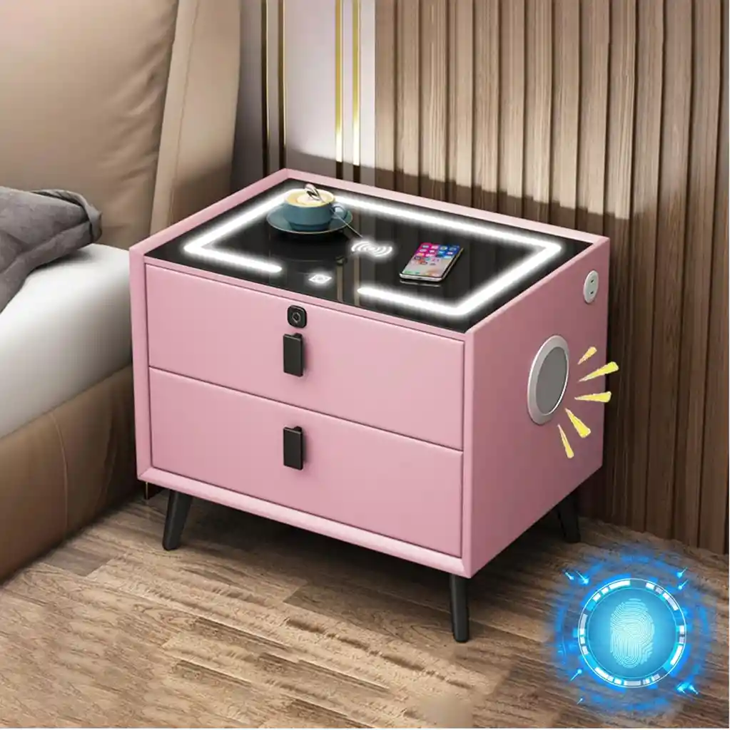 Mesa de Noche Inteligente • Dos Cajones • Tamaño: 45*45*45 cm • Incluye sistema de carga Inalámbrica • Luces LED Decorativa 3 Modos • Bocina Bluetooth • Dos Salidas USB 2.0 • 1 salida PD • Incluye un lector de huella para Cajón