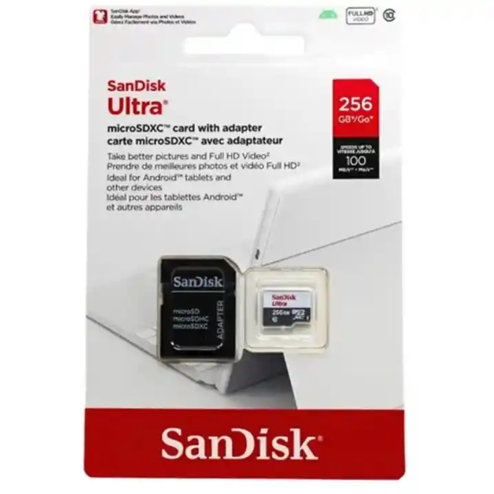 Tarjeta MicroSDXC. ORIGINAL! Su velocidad de lectura es de 100 MB/s y de escritura 80 MB/s. Posee adaptador de memoria. Su resolución máxima de video es Full HD. Almacena diferentes tipos de datos. Clase de velocidad: 10. Captura y guarda más fotos de alta calidad y video full HD2 en tu tableta o teléfono inteligente Android con las tarjetas SanDisk Ultra PLUS microSDHC™ y microSDXC™ UHS-I. Con capacidades de almacenamiento de hasta 256-GB, puedes tomar más fotos y videos sin tener que preocuparte por la falta de espacio. Micro sd 256-gb • Adaptador sd