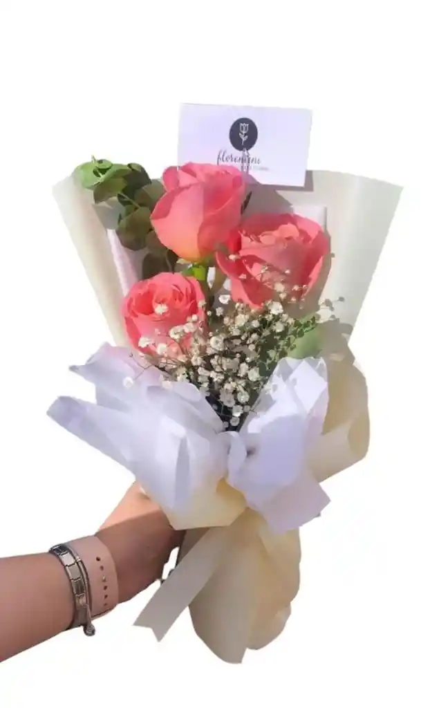 Tres unidades de rosa rosada con gypso y eucalipto Tres delicadas rosas rosadas que simbolizan ternura y gratitud, perfectas para sorprender con un pequeño pero significativo detalle. Nota: La flor puede ser sustituida dependiendo de la disponibilidad de color y del producto. "Mensaje Personalizado" máximo de 30 caracteres (Dejar el mensaje en el chat, los comentarios no se previsualizan para la tienda, por lo que si se dejan allí no podrá ser incluido).