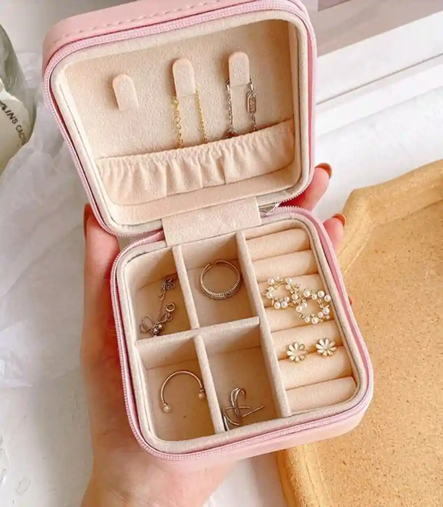 Mini joyero portátil con cierre, ideal para cuidar tus joyas en casa o fuera. Funcional, bonito y del tamaño perfecto.